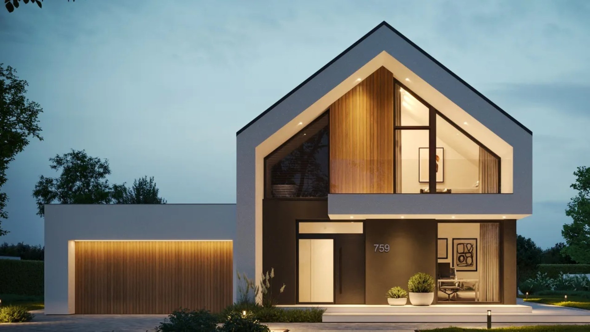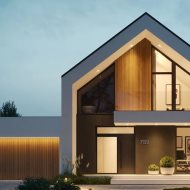 Architektura premium – prosta forma, akcenty z naturalnego drewna, elewacja z efektem „ramy” i imponujące przeszklenia na dwie kondygnacje.